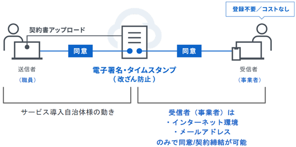 工事請負契約や業務委託契約等、村と契約する際に、今まで取り交わしていた紙の契約書を、インターネット上で完結するものです。受信者(事業者)はアップロードされた契約書類を確認し、承認するだけで契約が完了します。なお、利用にあたり事業者側での電子契約サービスの利用契約や費用負担、電子署名の準備などは不要で、メールアドレスがあれば利用可能です。